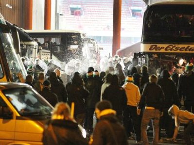 Der Polizei ging das Verlassen des Stadions nicht schnell genug, aber andererseits waren kaum Ausgänge geöffnet und es staute sich an den engen Toren. Es war fast schon logisch, dass die rabiate Gangart der wallonischen Polizisten ein Echo provozierte. An einem Ausgang gab es ein etwas hefteriges Hin- und Hergeschubse. Aber anstatt es deeskalierend zu klären, wurde gleich völlig überzogen aus dem Wasserwerfer gefeuert. Das machte aus einem lokal begrenzten Kleinkonflikt ein großes Ding. Denn natürlich erwischte es Unbeteiligte und natürlich solidarisierten sich weite Teile des Fanmobs mit den Angegangenen. Da tobte nun plötzlich eine unübersichtliche Schlacht auf dem Parkplatz und nahezu alle Busse wurden von der freundlichen Polizei gewaschen.