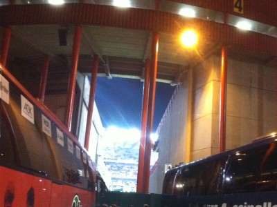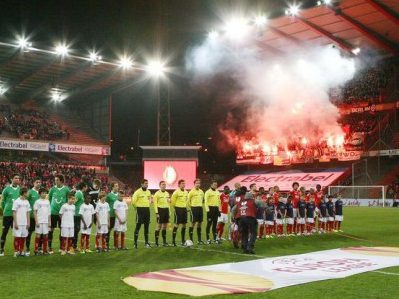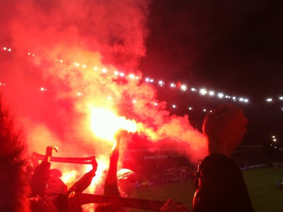 Dem gemeinen Fan blieb nur das Stadion als Sehenswürdigkeit vergönnt. Dieses fügte sich mit seinem granatroten Anstrich gut in die reizvolle Umgebung aus rostigen Hochöfen und anderen Industriebrachen ein. Es fasst 30.000 Zuschauer und wurde zuletzt für die EM 2000 aufgehübscht. Dennoch merkt man der Sportstätte an, dass es im Kern ein Stadion der 1970er Jahre ist. Der große Arena/Sportdome-Boom setzte erst nach der EM 2000 ein, wenn auch beim Co-Ausrichter Niederlande bereits die Pionierstadien dieser Ära Spielstätten waren. Im Stade Maurice Dufrasne, so der offizielle Name, gab es noch harte Sitzschalen ohne Rückenlehne und keine verglasten VIP-Logen. Wir waren im Mittelrang des Gästebereichs untergebracht und zündeten ein paar Freudenfeuer zu Spielbeginn.