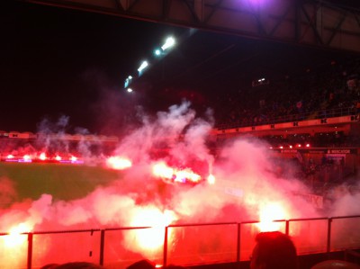 Dort wurden wir zu Beginn von organisierter Pyrotechnik erleuchtet. Vor den Tribünen wurden auf Stäben befestigte Fackeln kollektiv gezündet. Solche Aktionen goutieren wir eigentlich nicht, aber es sah schon ganz nett aus. Das Stadion verfügt übrigens über zwei große Tribünen auf den Geraden und zwei kleine hinter den Toren. Hinter einem Tor war der Gent-Fanblock und hinter dem anderen der Gästeblock. Von den heute anwesenden 11.347 Zuschauern im fast ausverkauften Stadion, drückten wenige Hundert dem Gast aus Westerlo die Daumen. Organisierten Support lieferten sie allerdings keinen. Ebenso kam von Gent verhältnismäßig wenig. Direkt hinter’m Tor war zwar ein kleiner Stimmungskern, aber vom Hocker riß einen die Atmosphäre erwartungsgemäß nicht.