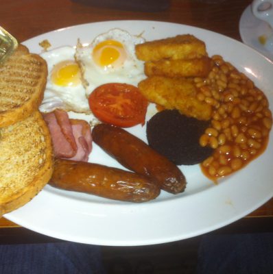 Die Eindrücke des ersten Abends mussten wie die konsumierten Unmengen von Alkohol erstmal verarbeitet werden. Entsprechend fiel am nächsten Vormittag das Verlassen der Hotelbetten ziemlich schwer, so dass gerade noch kurz vor Ultimo (Frühstück nur bis 12 Uhr) das Large English Breakfast für preiswerte 4.40 £ im Pub (wieder im Prince of Wales) geordert werden konnte. Dieses kulinarische Kulturgut der Britischen Inseln lieferte mit Würstchen, Schinken, Spiegeleiern, Black Pudding u. v. m. über 1.400 Kalorien für die Aufgaben des Tages und brachte den Nährstoffhaushalt wieder auf Vordermann.