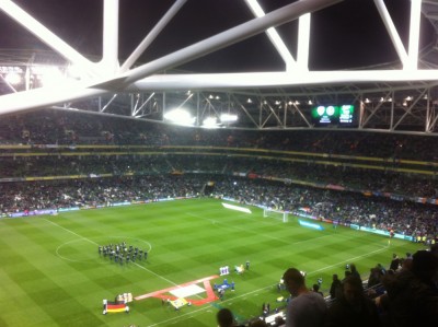 Innerhalb der Sportstätte platzierten wir uns auf der Gegengerade. Dort hatten wir sowohl die irischen Supporter als auch die deutschen Fans gut im Blick, sowie den besagten herrlichen Ausblick auf das nächtliche Dublin. Das Spiel war eine eindeutige Sache und der Support auf beiden Seiten mau. Bei den Deutschen ein bisschen Gepöbel gegen den DFB und immer wieder wurde in irgend einer Ecke „Mexiko“ oder „Deutschland, Deutschland“ angestimmt. Na ja, irgendwann in der 2.Hälfte, als die DFB-Auswahl endgültig den Gegner nach Belieben beherrschte, wurde etwas geschlossener gesungen und auch ein lautes „Oh wie ist das schön“ hallte durch’s Stadion. Die Iren scheinen dagegen „Fields of Athenrye“ nur bei Debakeln im Rahmen großer Turniere zu intonieren.