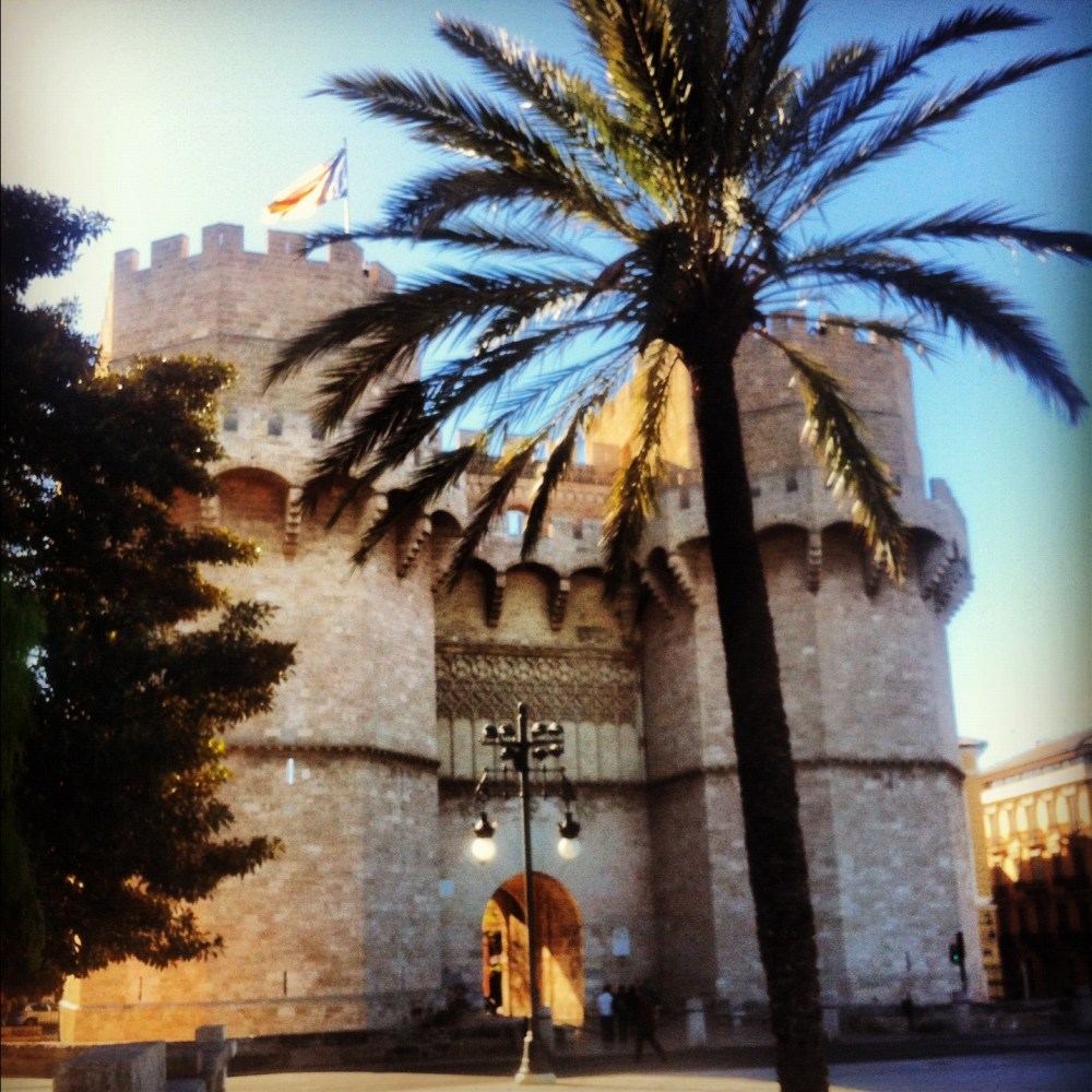 Der nächste Morgen begann mit einem Katerfrühstück und wurde mit einem Stadtrundgang fortgesetzt. Valencia hat doch so einiges zu bieten für’s Touri-Herz. Die Stadt hatte im Spanischen Bürgerkrieg (1936 – 1939) schwere Schäden zu beklagen und anschließend wurde sie – als Hochburg des Widerstands geltend – vom faschistischen Franco-Regime sehr vernachlässigt. Mittlerweile sind aber wieder weite Teile der Altstadt restauriert und der Tourismus in der 785.000-Einwohner-Stadt nimmt zu. Besonders herausragende Bauwerke sind die Kathedrale (siehe Titelbild) und das mittelalterliche Stadttor Torres de Serranos. Außerdem besticht der einstige Flusslauf des Turia mit seinen ausgedehnten Park- und Sportanlagen. Der Fluss trat regelmäßig über seine Ufer und verrichte oft verheerende Hochwasserschäden in der Stadt, so dass die Stadtväter in den 1950er Jahren beschlossen den Fluss um die Stadt herum zu leiten. Und anstatt der geplanten Stadtautobahn im alten Flusslauf, wurde sich nach Bürgerprotesten für die Schaffung einer grünen Lunge entschieden, welche die Lebensqualität in Valencia nochmal verbesserte.