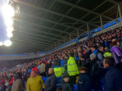 Für 26 £ erwarben wir die günstigsten Tickets der Gegengerade, nah am Spielfeldrand und gleich neben dem Gästeblock. Das Stadion ist klassisch strukturiert. Hinter einem Tor der Heimfanblock, in einer gegenüberliegenden Ecke der Gästesektor und hinter dem anderen Tor ein Familienblock. Die Haupttribüne ist gespickt mit Logen und Business Seats, während die Gegengerade profanere Plätze bei bester Sicht bietet. Optisch ist das Ganze in meinen Augen ein 08/15-Neubau mit wenig Liebe zum Detail und ohne besonderen eigenen Charakter. Erinnerte ein wenig an das neue Wedaustadion in Duisburg oder an den Gladbacher Borussia-Park ohne Oberrang. Kein Vergleich zum alten Ninian Park.