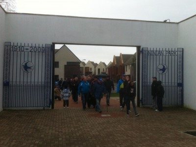 Im Pub dominierte ganz klar blau, aber als Spitze der Protestbewegung wirkten die Fans dort auch nicht. Einfach eine bunte Mischung aus Fans, die sich wahrscheinlich am liebsten Erfolg und Traditionserhalt gleichermaßen wünschen würde. Auch am neuen Stadion, welches noch vor der Ära Tan gebaut wurde (Eröffnung 2009), stachen dann verschiedene Blautöne an der ansonsten recht grauen Fassade hervor. Vom alten Ninian Park war leider nur ein schönes Eingangstor übrig geblieben, welches allein auf weiter Flur stand. Außerdem wurde zur Traditionspflege eine Statue von Fred Keenor (Kapitän der FA-Cup-Sieger von 1927) errichtet.