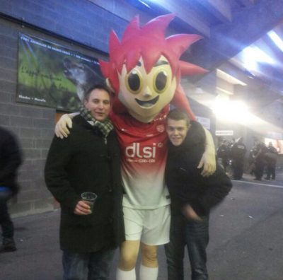 Wer von uns nicht gerade den VIP-Bereich plünderte, schaute angrenzend zur Nancy-Fantribüne das mittelmäßige Spiel, bei dem ASNL erstmals nach 35 Minuten in Führung gehen konnte. Von einem Mitglied unserer Gruppe scheint dieser französische Verein in Windeseile das Herz erobert zu haben. Anders ist jedenfalls nicht zu erklären, dass er bei diesem Tor so heftig aufspringt, dass er ein paar Reihen nach unten in einen Kindergeburtstag purzelt. Milano und ich trieben dagegen in der Halbzeit Kindereien mit dem seltsamen Maskottchen des ASNL. Néné hieß das Ding glaube ich, passend zu unserer Reaktion auf das unansprechende Catering-Angebot hier.