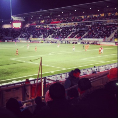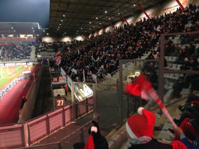 Heute passierten rund 14.000 Besucher die Stadiontore, wovon ca. 200 den Gästeblock bevölkerten. Dafür dass ihre Anreise 30 km länger als unsere war, war das auf einem Freitag in der 2.Liga okay, denke ich. Zu Beginn der zweiten Halbzeit zündeten sie sogar drei bengalische Fackeln. Pyro ist ja irgendwie immer, wenn wir mal hoppen. Nancys Ultras zündeten bereits zu Spielbeginn eine handvoll Fackeln und bevölkerten einen Block hinter dem Tor. Sie sind mit Saarbrücken befreundet und so waren auch ein paar Saarbrücker heute mit am Start, die uns bereits vor dem Stadion als Deutsche identifizierten und mit denen wir dann etwas Smalltalk hatten.