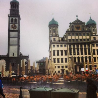 Nach diversen Bieren, und nachdem auch der seperat angereiste Pumba dazugestoßen war, spazierten wir noch ein wenig durch die Gemeinde. Augsburg hab ich ja nun schon ein paar Mal gesehen, aber es hat dort genug schöne Ecke, um jedes Jahr auch andere Orte als das schnöde Stadion und irgendwelche Pinten aufzusuchen. Im historischen Stadtzentrum dominieren die Basilika St. Ulrich und Afra und der Perlachturm die Stadtsilhouette. Zusammen mit dem Rathaus, welches zu den bedeutensten Profanbauten der Renaissance nördlich der Alpen zählt. Auf weitere touristische Höhepunkte wie die Fuggerei oder Teile der erhaltenen mittelalterlichen Stadtbefestigung verzichteten wir heute aus Zeitgründen und brachen just in time zum Augsburger Stadion auf.