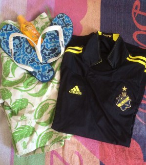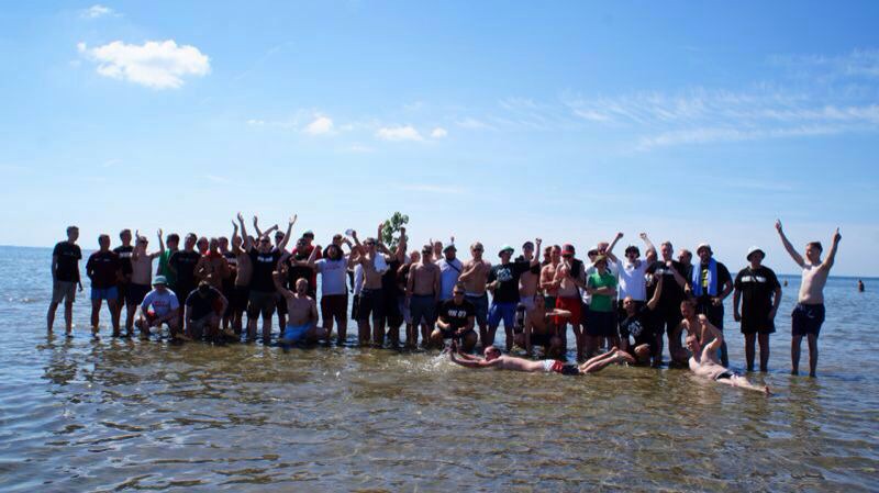 Am Vormittag trafen schließlich unsere Freunde aus der Hauptstadt in großer Anzahl ein. Falkenberg war aus schwedischer Fansicht eher ’ne Hausnummer wie Sandhausen, aber im Gegensatz zu besagter deutscher Kleinstadt eben ein Sandhausen mit Sandstrand. Das verlockte viele AIK-Anhänger an einem der heißesten Tage des Jahres zu einem Strandtag. Das Thermometer kletterte mittags auf über 30° C und wirkliche Abkühlung verschaffte nur noch das Meer. Im Wasser konnte auch das mitgebrachte Carlsberg-Sortiment besser gekühlt werden und die Beach Party nahm ihren Lauf. Ich hatte übrigens schon schlechtere Ideen als einen aufblasbaren Strandball auf diese Reise mitzunehmen. Die sportliche Betätigung lenkte etwas von den zahlreichen schwedischen Bikini-Schönheiten ab. Aber nur etwas…