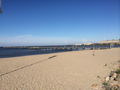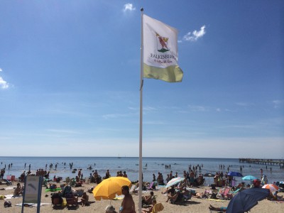 Danach ging es bei strahlendem Sonnenschein durch Schonen (die historische Provinz, wo die Südschweden so schön wohnen) gen Norden. Bescheidene 120 km trennten uns noch von Falkenberg in der Provinz Halland. Das war für mich nochmal Gelegenheit für ein Stündchen die Augen zu schließen, um dann gegen 8 Uhr morgens in Falkenberg zu erwachen. Es zog unsere Gruppe gleich zum Skrea Strand, der wirklich sehr schön war und bereits jetzt mit deutlich über 20° C Lufttemperatur aufwartete. Noch war er menschenleer und wir breiteten unsere Handtücher aus. Danach eine kalte Dusche und ab in die Badehose. Gut eingecremt wurde jetzt gefrühstückt, was die Fähre so hergab und in der Sonne gedöst. Einige schliefen auch ein, was bei den uneingecremten Jungs fatal endete.