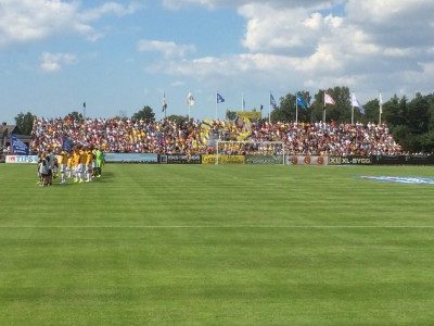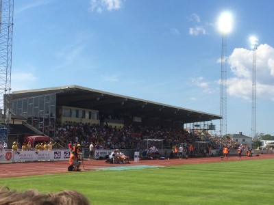 Etwa eine Stunde vor Abpfiff pilgerte die schwarz-gelbe Karawane schließlich zum Stadion, welches in Deutschland höchstens in der Regionalliga zugelassen wäre. Durch Stahlrohrtribünen wurde die Kapazität für die Premierensaison in der höchsten schwedischen Liga immerhin auf um die 5.500 Plätze erhöht und die waren heute alle belegt. Mit AIK war schließlich einer der größten Clubs des Landes erstmalig in einem Pflichtspiel zu Gast, was alle fussballinteressierten Falkenberger und bestimmt 1.500 AIK-Fans mobilisierte. Der Anhang vom Allmänna Idrottsklubben sorgte auch lautstark für ansprechende Kulisse, während so etwas wie ein Heimfanblock nur schwer auszumachen war. Na ja, klatschen und schreien haben die Einheimischen nach ihren Toren ganz gut hinbekommen. Und davon gab es leider vier.