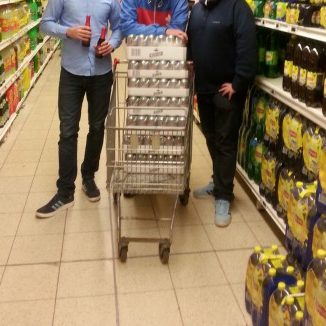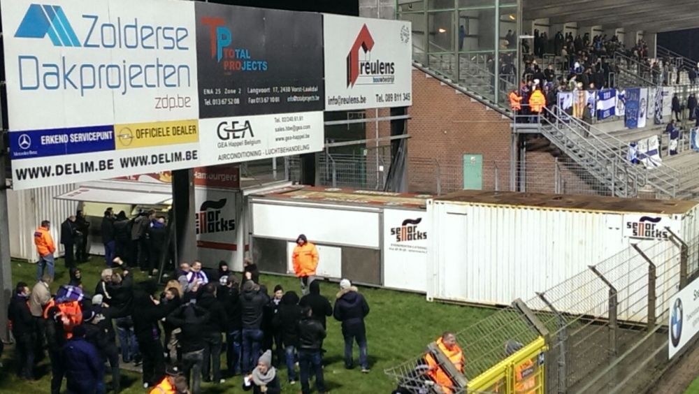 Nach einer entspannten Fahrt über die baustellen- und staufreie A2 erreichten wir (El Glatto, Milano Pete, Ole und ich) das belgische Westerlo zeitig genug, um in einem Supermarkt lokale Bierspezialitäten zu erwerben. Die Regale im Carrefour waren danach ziemlich leer und der Kofferraum ziemlich voll. Ebenfalls recht leer waren nun die Portmonnaies der Reisegruppe und an der Stadionkasse wurden blöderweise keine Kreditkarten akzeptiert. Nur Bares war Wahres. Hätte man ja ahnen und an der Supermarktkasse die Karte zücken können. Aber wer denkt schon rational, wenn er einen Einkaufswagen voll mit Bier zum Kassierer schiebt? Also alles zusammengekratzt und Stehplätze für 15 € gekauft. Waren quasi Karten für den Heimfanblock, also wurde sich am Rand der Hintertortribüne platziert. Links von uns standen jetzt also die Supporter des KVC Westerlo, rechts war gleich die Bierbude und auf der angrenzenden Tribüne (Gegengerade) hatte sich der Gästemob platziert. Gab schlechtere Standorte.