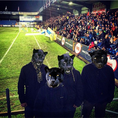 Nur 12 km von Westerlo entfernt liegt Geel, wo rund 10 Minuten nach Abpfiff in Westerlo das zweite Spiel des Tages steigen sollte. Tweede Klasse (2.Liga) schürrte jetzt keine großen Erwartungen, umso erfreuter waren wir, als wir unbewusst hinter der Gästetribüne parkten und diese mit ca. 150 Fans gefüllt war. Da keine Zeit blieb um das Stadion zu umrunden, platzierten wir uns auf der gleichen Tribüne (12 € Vollzahler) und sahen Sinter Klaas noch letzte Geschenke an kleine Kinder verteilen, bevor wenige Sekunden später der Schiri in seine Pfeife bließ. Patro hatte so ca. 40 Ultras, die hauptsächlich den Szene-Ninjazipper spazieren trugen (einer sogar in Kombination mit Shorts bei Temperaturen um den Gefrierpunkt) und jene befestigten neben ihren Bannern eine Gummipuppe am Zaun. Außerdem ließen ihre Gesänge auf eine gesteigerte Antipathie deuten. Geel wurde abwechselnd auf Niederländisch und Italienisch durchbeleidigt.