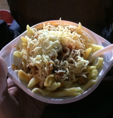 Die Halbzeitpause war schließlich der perfekte Zeitpunkt, um das kulinarische Angebot zu testen. Natürlich ist das in Aue ohne lästige Bezahlkarte möglich und das Angebot in den hübschen Holzhütten ist reichlich. Die Rauchwurst im Brötchen (für 3 €) schlug die ebenfalls leckere Bratwurst (2,50 €) geschmacklich knapp. Beides war schön kross gegrillt. Natürlich ließen wir es uns auch nicht nehmen den berühmten Auer Nudeltopf zu kosten. Man bekommt für 3,50 € Spirellis mit Jagdwurst in einer Gewürzketchupsauce mit geriebenem Käse on top. Geschmacklich okay, aber der Hype in der Hopperszene erklärt sich wohl eher durch die Exklusivität, denn durch die Raffinesse dieser Speise. Begleitet wurde unser Abendessen übrigens von 0,4 l Wernesgrüner à 2,50 €. Beim Genuss der Produkte fiel uns die fehlende Werbedauerbeschallung in der Pause auf. Stattdessen wurden neben den Zwischenständen der anderen Plätze Wintersportergebnisse durchgesagt, die das Bergvolk hörbar interessierten.