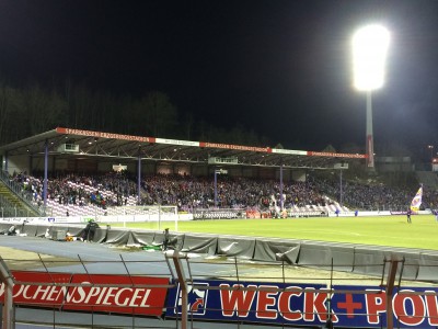 Mein kleiner Bruder (der Ziii) brauchte in der finalen Phase seines Studiums etwas Ablenkung von seinen Büchern. Also wälzte er lieber mal für eine Stunde Spielpläne statt Fachliteratur und trat Anfang Februar mit einem interessanten Reiseentwurf an den Freundeskreis heran. Der Zuspruch für seine angedachte Tour nach nach Sachsen und Böhmen war enorm, so dass sich am 20.Februar acht Personen auf zwei PKW verteilten. Wir starteten um 13 Uhr in Hildesheim gen Aue, wo Darmstadt 98 um 18:30 Uhr beim FC Erzgebirge Aue gastieren sollte. Dank Staus und Behinderungen wurde das üppig eingeplante Zeitpolster zwar beinahe komplett aufgebraucht. Doch gegen 18:10 Uhr tauchten nach einer Straßenkurve die hellen Flutlichtmasten des Erzgebirgsstadions auf, welches malerisch im Lößnitztal liegt. Nun mussten wir nur noch ein paar Kilometer den Berg runter rollen und parkten dank eines Tipps ebenfalls angereister Hannoveraner auf dem Gästeparkplatz, von wo man auch problemlos die Gegengerade ansteuern konnte. Dort wiederum konnte man Tickets für 11 € Vollzahlerpreis an der Tageskasse lösen. Sehr fairer Kurs für überdachte Sitzplätze!