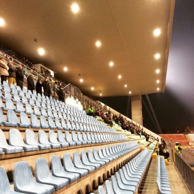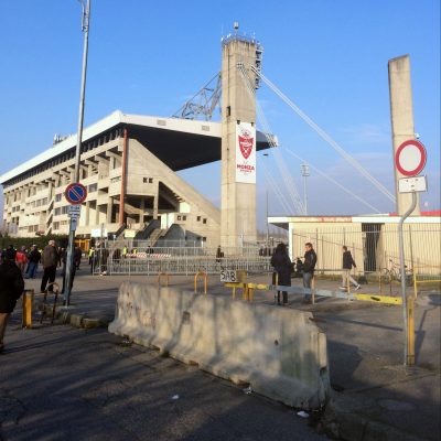 So ging es mit hungrigem Magen weiter zum Fußballstadion der Stadt; dem Brianteo. Das wurde 1988 eröffnet und ist eine der typischen italienischen Betonburgen. Immerhin hat man das Grau vor nicht all zu langer Zeit mit etwas Farbe in Clubfarben Rot und Weiß ergänzt. Im Stadion, welches nur auf der Haupttribüne überdacht ist, waren lediglich Heimkurve und jene Haupttribüne geöffnet. Völlig ausreichend bei der tristen Kulisse von gerade mal 1.186 Zuschauern (Kapazität: knapp 19.000 Plätze).