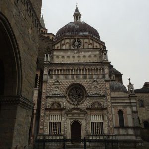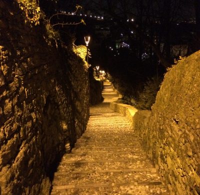 Nach dem Essen bestiegen wir dann wieder den Zug nach Bergamo und ließen den ersten Abend in der Oberstadt (Altstadt) sehr charmant ausklingen. Die Città Alta liegt deutlich über der Unterstadt und ist für 1,30 € mit einer Standseilbahn erreichbar. Oder für sportliche Menschen über viele Treppen per pedes. Oben angekommen, versprüht sie mit ihren engen Gassen, prächtigen Kirchen und schnieken Profanbauten ein herrliches Flair. Dazu hat man von diversen Punkten tolle Ausblicke. Im Norden grüßt das Alpenpanorama und im Süden blickt man auf die fruchtbare Po-Ebene. An diesem ersten Abend waren natürlich nur die Lichter der Unterstadt sichtbar (was auch sehr fotogen war), aber die kommenden Tage sollten wir die Panoramen noch bei Tageslicht geniessen dürfen.