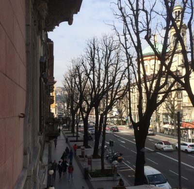 Nun denn, da ich das altehrwürdige Stadio Giuseppe Meazza nicht als einziger auf der Agenda 2015 stehen hatte, war eine Reisegruppe schnell zusammen. Wenn man Freunde hat, die auf Namen wie Milano Pete oder Gianni di Lorenzo (a. k. a. Fat Lo) hören, auch kein Wunder. Wundersamer war da schon, dass ich dennoch die besten Italienischkenntnisse der Gruppe hatte. Den frühkindlichen Musikeinflüßen von Gianna Nannini sei Dank. Ehrensache, dass die toskanische Rockröhre auf der Fahrt zum Flughafen Niederrhein aus den Boxen dröhnen durfte. Und als wäre das noch nicht musikalisch genug, hieß unsere Unterkunft in Bergamo Giada Donizetti (benannt nach dem großen Opernkomponisten Gaetano Donizetti). Ironischerweise war sie überbucht, so dass wir ein Upgrade bekamen und in einem luxuriöseren Hotel in der Nachbarschaft untergebracht wurden. Zu diesem führte uns die hochattraktive Hotelfachfrau Nadia, die nicht mit Tipps rund um den Aufenthalt in Bergamo geizte. Da eines unserer Zimmer „L’Elisir d’amore“ hieß, blieb zum Glück auch in der neuen Unterkunft der Donizetti-Bezug gewahrt.
