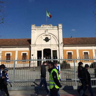 Leider kam unser Taxifahrer irgendwann nicht mehr weiter und wir wollten zu Fuß an einer der zahlreichen Polizeisperren vorbei. Auch das war nicht möglich. Die Polizei teilte uns mit, dass es heute für uns Touristen keine Tickets gibt und wir uns für die nächsten Stunden ein anderes Programm überlegen sollen. Weil die Polizei in Italien ein ähnlich glaubwürdiger Ratgeber wie in Deutschland ist, ließen wir uns nicht entmutigen und wagten den großen Törn zum Stadioneingang. Da Strasse und Stadion von einem Fluss getrennt waren und die Brücken am Stadion fest in der Hand der Polizei waren, mussten wir nun einen großen Umweg mit vierstelliger Meterzahl gehen, um den Fluss zu überqueren und uns im Rücken der Polizei über einen Fußweg ans Stadion ranzupirschen.