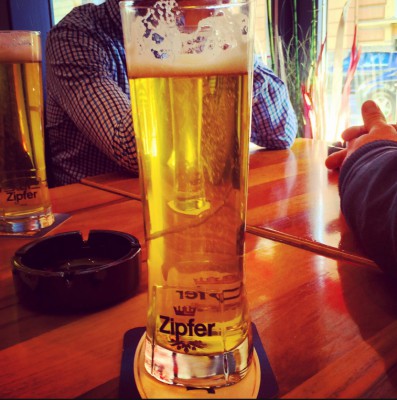 Vor’m Match suchten wir noch eine feine Gastwirtschaft auf, die in der Happy Hour das 0,5 l Zipfer für 2 € servierte. So günstig hatten wir Innsbruck nicht erwartet. In Sachen günstig Frühstücken / Essen (und Trinken) schiebe ich an dieser Stelle mal für junge und junggebliebene Leute den Breakfast Club als Empfehlung ein. Insgesamt ist das Preisniveau von Innsbrucks Gastronomie im Rahmen (neben teuer geht auch preiswert) und die Einheimischen sind nicht so „charmant“ wie die Salzburger oder Wiener gegenüber uns Deutschen. Oder sie verbergen das besser. Die Zecher von der Theke waren auf jeden Fall sehr freundlich zu unserer Gruppe und besorgten für uns den besten Taxifahrer der Stadt. Rudi, ein Ur-Innsbrucker jenseits der 50, trug schwarze Cowboystiefel und Leder-Joppe. Er wusste alles und kannte jeden Schleichweg.
