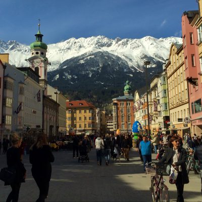 Im schönen Kufstein hieß es dann abermals die Biervorräte auffüllen, Sonne tanken und auf den verspäteten EuroCity Richtung Bologna warten. Der war recht voll, aber irgendwie kam unsere extended group, verteilt auf zwei 6er, doch noch zu Sitzplätzen. Kurz vor Innsbruck hieß es dann Abschied nehmen von unseren neuen Freunden, die nach Mayrhofen umsteigen mussten, und dann war die Alpenmetropole Innsbruck endlich erreicht. Bei dem bereits mehrfach gewürdigten strahlenden Sonnenschein spazierten wir aus dem Bahnhof zur Altstadt hinunter. Wir fotografierten dort Asiaten beim Goldenes Dachl fotografieren und schlenderten durch diese wunderschöne Stadt. Verfolgt wurden wir dabei von drei Buben in schwarzen Trainingshosen und schwarzen Windbreakern. Da fiel uns auch wieder ein, dass heute ja Fussball war und der Anstoß gar nicht so fern in der Zukunft lag.