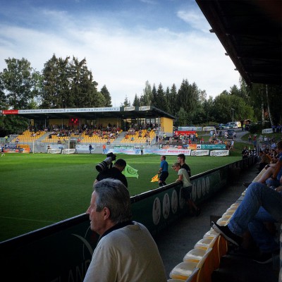 Etwa eine Stunde vor Spielbeginn (18:00 Uhr) brachen wir zum etwas exponiert gelegenen Stadion auf, welches ein reines Fußballstadion mit drei Tribünen ist. Haupt- und Hintertortribüne sind gelb bestuhlt und überdacht und an sie grenzen jeweils noch ein paar unüberdachte Stehtraversen. Die Gegengerade beherbergt den Gästebereich auf ganzer Länge. Allerdings sind das nur ein paar unüberdachte und eingezäunte Stufen.