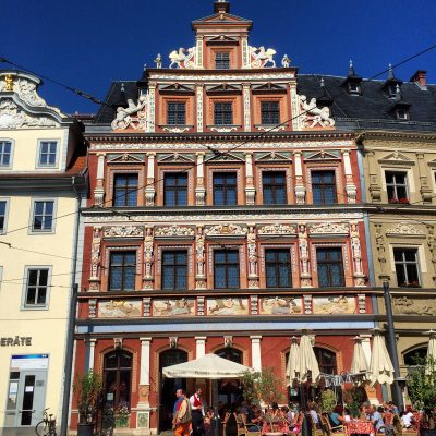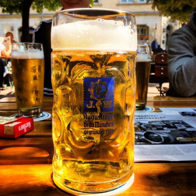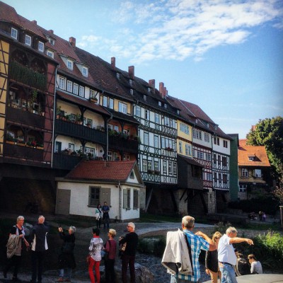 Wie passend, dass an diesem Wahrzeichen Erfurts (eine mit Fachwerkhäusern überbaute Brücke über die Gera) ein Augustiner-Biergarten angesiedelt war. Der durfte uns erstmal mit ein paar Krügen Edelstoff bewirten. Auch das Essen, Bachforelle und natürlich die obligatorischen Thüringer Rostbratwürste, mundete vorzüglich. Allerdings empfand uns der Grillmeister als unhöflich. Auf „Machste uns bitte nochmal zwei Brat?“ entgegnete er „Kennen wir uns irgendwo her oder warum duzen sie mich?“. Unsere Kumpel-Mentalität kommt halt nicht bei jedem gut an.