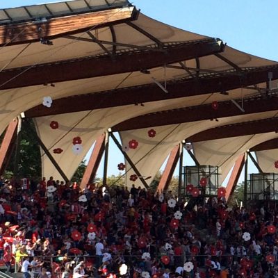 Dafür waren die beiden Fanblöcke sehr gut von unseren Plätzen zu sehen. Und beide boten was für’s Auge. Die Gäste aus dem Erzgebirge spannten ein großes Banner mit der Aufschrift „Für immer Wismut Aue“ vor den Block und hatten zahlreiche lila-weiße Schwenkfahnen im Gepäck. Erfurt wiederum, deren Ultras während der Umbauphase die äußeren Blöcke der Haupttribüne besiedeln, präsentierte mittig auf der Tribüne eine Blockfahne. Darauf waren das Stadtwappen und sowohl das alte, als auch das aktuelle Vereinslogo zu sehen. Drumherum hatten sie auf jedem Platz eine Pappblume ausgelegt, wovon jede auf einer Seite rot und auf der anderen weiß war. Das Ganze sollte eigentlich eine Wendechoreo werden, aber der gemeine Erfurter Tribünenbesucher war damit überfordert. Deshalb gab es nicht wirklich ein synchrones Bild zu sehen. Spruchband dazu war: „Du erstrahlst in Deiner rot-weißen Pracht – bist die Blüte, welche die Blumenstadt zu etwas Besonderem macht“. Schöne Choreographie, aber eben mit Abzügen in der B-Note.