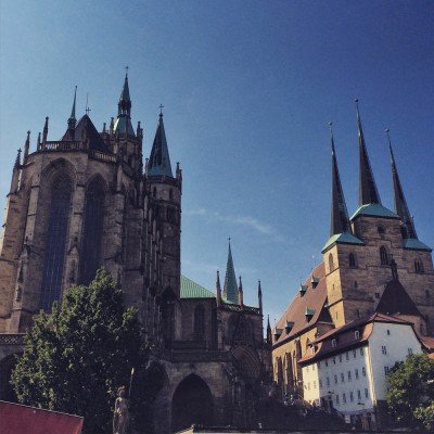 Essen gab es zum Glück trotzdem und gut genährt ging es eine Maß später über die Krämerbrücke weiter zum Erfurter Dom. Der Domplatz ist in Thüringens Hauptstadt ungewöhnlich großzügig dimensioniert. Die 15 bis 20 Marktstände am heutigen Tag wirkten fast schon etwas verloren. Besagter Dom und die ebenfalls große Severikirche, direkt daneben auf dem exponierten Domberg, waren natürlich ein tolles Fotomotiv. Auch hier verweilten wir noch ein wenig und genossen das Panorama und das herrliche Wetter. Roy Ayers hatte schon recht; everybody loves the sunshine…