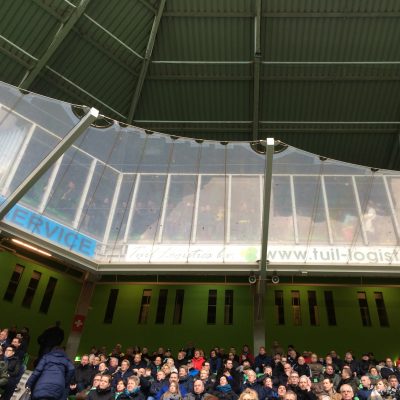 Drinnen sah der Komplex im Gegensatz zu draußen wie ein richtiges Stadion aus, mit kompletter Bestuhlung in den Vereinsfarben und stimmungsfreundlicher Architektur. Nicht so eine Halle wie exemplarisch in Arnheim oder Gelsenkirchen, eher so wie beispielsweise die Duisburger oder Aachener Stadionneubauten. Gästefans waren auch ein paar Hundert da und saßen oder standen im zweirangigen Stadion über unseren Plätzen in einem landestypischen Gästekäfig. Aber genau wie die Heimfans hinter dem Tor (der harte Kern um die Groningen Fanatics steht im Randblock der Hintertortribüne), rissen sie in Sachen Stimmung keine Bäume aus.