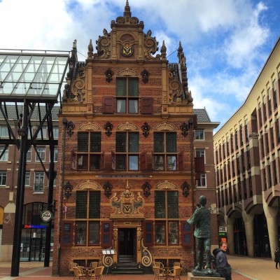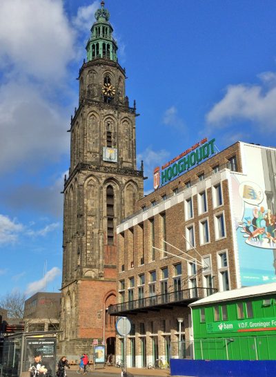 Und apropos Infrastruktur, Hauptverkehrsmittel des Groningers ist das Fahrrad. Das merkten wir schon bei unserem Stadtspaziergang, der immer wieder vom Gebimmel der Fahrradklingeln begleitet wurde. Nichtsdestotrotz kamen wir unfallfrei voran und sahen eine interessante Symbiose aus alt und neu. Kurz vor Kriegsende tobte leider ein heftiger Kampf um die Stadt zwischen alliierten Truppen und den deutschen und niederländischen Verteidigern. Der Wiederaufbau folgte dabei zunächst mehr unter pragmatischen, denn ästhetischen Gesichtspunkten (siehe Ostseite Grote Markt), aber auch einiges an alter Bausubstanz konnte erhalten bzw. restauriert werden (siehe Südseite Grote Markt oder das herausragende Renaissance-Kaufmannsgebäude Goudkantoor in der Waagstraat).
