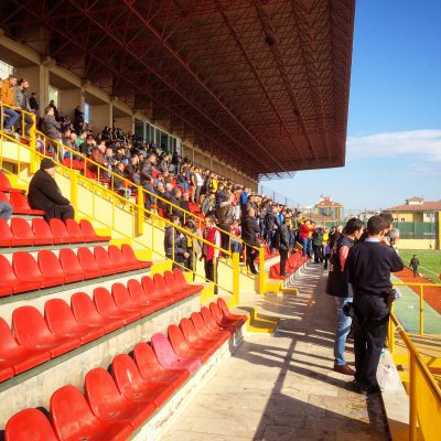 Mit der Metro verlagerten wir uns von Beyoğlu nach Bahçelievler. Dort flanierten wir durch die tourifreie, aber sehr belebte Haupteinkaufsstraße (die offizielle Einwohnerzahl des Viertels beträgt übrigens 599.000) und kämpften uns zum Bahçelievler İl Özel İdare Stadyumu durch. Als wir in die Straße des Stadions einbogen, trug uns der Schall schon das beliebte „Dale Boca /Cavese / etc.“ entgegen. Performt mit Blasinstrumenten. Das könnte doch ganz gut werden, dachten wir uns, und wurden nicht enttäuscht. Nachdem umgerechnet 3 € gelöhnt waren, platzierten wir uns am Rand der einzigen, aber großen Tribüne und waren hoch erfreut, dass neben der Kapelle auch einige sangesfreudige Fans den Weg ins Stadion gefunden hatten. Insgesamt 540 Zuschauer waren heute da und drückten fast alle sichtbar ihre Sympathie für die schwarz-gelben Hausherren aus. Ein Club, der 1926 von Eleven des Istanbul Lisesi gegründet wurde (einem renommierten deutsch-türkischen Gymnasium in Istanbul).