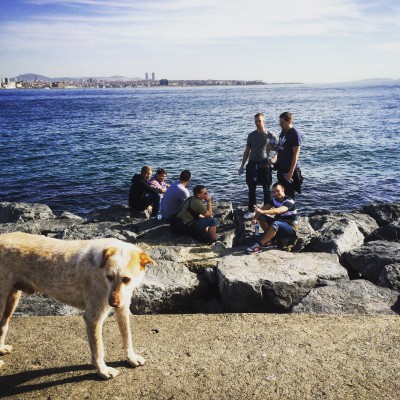 Nach diesen Sehenswürdigkeiten spazierten wir die Theodosianische Landmauer entlang zum Ufer des Bosporus. Dort konnten wir uns, neben dem Panorama, auch an einem Einheimischen mit Klampfe und unserem neuen Freund Bazillus erfreuen. So tauften wir den sympathischen Straßenköter, der uns die nächste Stunde nicht mehr von der Seite weichen sollte. Mit Bazillus zogen wir nun das Ufer lang, wo man sich mit Luftgewehr-Schießen auf Luftballons amüsieren konnte.