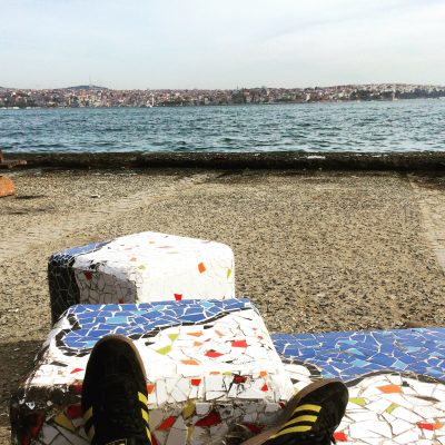 Dienstag war morgens die Hälfte des Mobs natürlich noch gerädert vom Vortag, während ich und die anderen Früh-ins-Bett-Geher schon wieder auf heißen Kohlen saßen. Wir marschierten heute zunächst am Kanonenhof von Tophane vorbei und von dort weiter in Richtung Dolmabahçe-Palast, um unweit dieses Schmuckstücks mit der Fähre nach Kadıköy (auf asiatischer Seite) abzulegen. Aber nicht ohne noch in der Mittagssonne im T-Shirt am Bosporus einen Tee zu trinken und den Ausblick zu genießen.