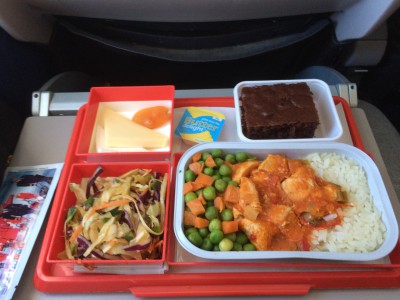 12:40 Uhr war unser Start und nachdem die „Reisegruppe Urgemütlich“ zwei Stunden vor Abflug am Düsseldorfer Flughafen wieder vereint war, wurde das nicht benötigte Zeitpolster mit einem zweiten Frühstück bei Mc Donald’s mit Leben gefüllt. Gott, wird das wieder eine Diätreise… Schnell noch jeder im Duty Free Shop die Schnapssorten durchprobiert (und doch nur den billigen Osborne Veterano für 10 € pro Liter eingetütet) und schon gab es im Flieger das dritte Frühstück bzw. das Mittagessen. Es wurde wahlweise vegetarisches Frikassee oder Hähnchen in Tomatensauce gereicht. Dazu Brötchen, Käse, Salat und Kuchen. Danach hatte ich die nötige Bettschwere, um nochmal ein Auge zuzudrücken.