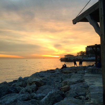 Auch in Kadıköy musste irgendwann gegessen werden und gewonnen hatte in der großen Lotterie die Ocakbaşi namens Otantik. Hier wurde Fladenbrot von einer alten Omi frisch auf dem offenen Feuer gebacken und der Grillmeister verstand ebenfalls sein Handwerk. Ich gönnte mir für ca. 10 € von allem etwas und wurde geschmacklich schon wieder nicht enttäuscht. Mit Tee und süßen Dessertsünden blieben wir nach dem Essen noch in den Sofas des Restaurants versunken. Das tat gut, nachdem schon wieder über 10 km auf dem Tachometer standen. Mit neuen Kräften konnte anschließend der nächste Programmpunkt angegangen werden; der Sonnenuntergang am Meer.
