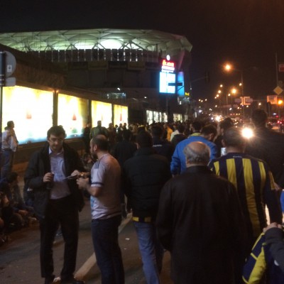 Zur Blauen Stunde spazierten wir ziemlich genau eben jene 60 Minuten komplett am Marmarameer entlang zum Şükrü Saracoğlu Stadyumu. War sehr nett, bis wir kurz vorm Stadion an dem fäkalienverseuchten Kanal Richtung Spielstätte abbogen. Nicht nur, dass es nun die letzten paar hundert Meter abartig roch, nein, hier waren nun auch die ersten Fenerbahçe-Mobs, die uns sehr kritisch musterten und für Russen hielten. Ein dunkler Park voller Fener-Fans war jetzt nicht der schönste Ort der Welt für uns. Überspitzt gesagt, wurde aber erst gefragt, bevor zugestochen wurde und wir kamen trotz der geballten Aufmerksamkeit der Einheimischen mit ein paar „No Russians! Almanya!“ Bekundungen unbeschadet zum Stadion.