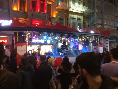 Das Hotel war dann wenig überraschend nicht so gut in Schuss wie auf den Bildern (da wirkte es fast schon luxuriös und von Schimmel war nichts zu sehen), aber für 8 € pro Nacht und Person wollen wir mal keine großen Ansprüche stellen. Und Mr Bayram, der Manager, stellte sich auch als höflich und hilfsbereit heraus, bevor wir erstmal in Richtung İstiklâl Caddesi (Unabhängigkeitsstraße) schieden. Diese Straße ist die berühmte Hauptader des Viertels Beyoğlu. Eine Straße, auf der an einem Samstagabend das Leben pulsierte und eine Band in einem zur Bühne umgebauten historischen Straßenbahnwagen den Menschenstrom musikalisch einheizte.