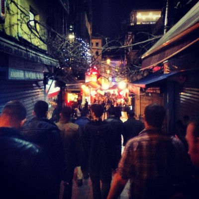 Wir ließen uns treiben und waren irgendwann am Galataturm angekommen. Auch nachts ein sehenswertes und nun illuminiertes Wahrzeichen der Stadt und nicht weit vom Wasser entfernt. Hier bot sich uns das Panorama der Stadtteile Sultanahmet und Fatih und nachdem das Bild ausreichend auf uns gewirkt hatte, gab es Abendbrot in Form von gegrillter Sucuk und anderen Spezialitäten der hiesigen Küche. Gut genährt waren die kneipenumsäumten Nebenstraßen des Hauptboulevards unser nächstes Ziel. Es gab einige Bars in denen richtig was los war und einige Bars mit gähnender Leere, in die uns ständig Werber locken wollten.
