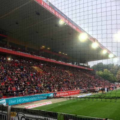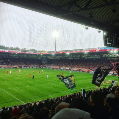 Als ich, nach mittlerweile Larifari-Kontrolle, auch endlich drin war, grüßte am Gästeblock ein bekanntes Zitat von Nick Hornby aus „Fever Pitch„. „Ich verliebte mich in den Fußball, wie ich mich später in Frauen verlieben sollte: plötzlich, unerklärlich, unkritisch und ohne einen Gedanken an den Schmerz und die Zerrissenheit zu verschwenden, die damit verbunden sein würden“, stand da an die Fassade gepinselt. Und ein paar Meter daneben: „Willkommen im Stadion an der Alten Försterei – Dem Fußball gewidmet.“