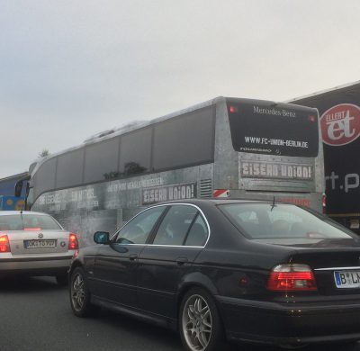 Kaum war das mutmaßliche Fascho-Mobil von der Autobahn abgefahren, landeten wir auch schon an einem Stauende. Ein LKW, mit Frostschutzmittel beladen, war kurz zuvor umgekippt und die A2 wurde vollgesperrt. Gemeinsam mit dem Mannschaftsbus des morgigen Gegners 1.FC Union steckten wir vor Helmstedt-West fest und kamen nur mühsam bis zur Abfahrt voran. Unser Fahrer zitierte nun seinen Chef: „Bei Stau ist der Standstreifen grundsätzlich für Mitarbeiter unserer Firma freigegeben!“ Aber es war ja keine Geschäftsreise. Deshalb wurde sich zäh bis zur Abfahrt rangetastet, wo sich die Automassen die Abfahrt herunter schlängelten.