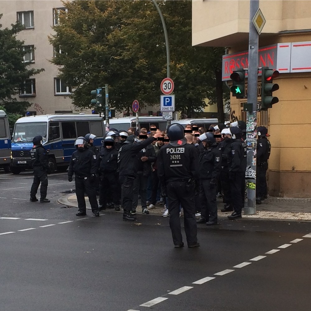 Erstmal frühstücken und dann ’ne Limo kaufen waren meine ersten Handlungen in der süßen Freiheit. Danach ließ ich mir vom mittlerweile in Marsch gesetzten Mob und seinen uniformierten Begleitern den Weg zum Ostbahnhof zeigen. Von dort fuhr ich mit der S-Bahn nach Köpenick, wo auch zwei Stunden vor Spielbeginn schon reichlich was los war. Ich beschloss nun Sightseeing in Alt-Köpenick als Lückenfüller bis zum Anpfiff.