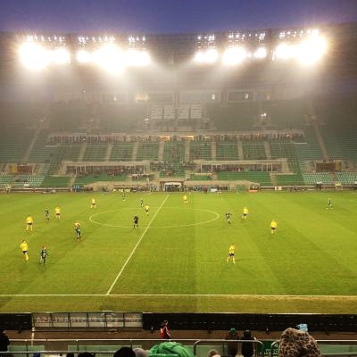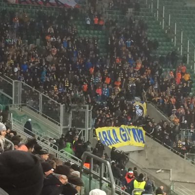 Nach dem Doppelschlag der Nordlichter waren wir nicht überrascht, dass die Heimfans nun mächtig angepisst waren. Diverses Beutegut in grün, weiß und rot an der Brüstung des Gästeblocks tat sein übriges. Ein Ranpirschen an den Gästeblock gelang den Gewaltbereiten jedoch nicht und unten auf dem Rasen passierte bis zum Abpfiff auch nichts Nennenswertes mehr. Loben muss man am Ende beide Fangruppen für ihren Support heute. Immer laut und mit hoher Mitmachquoten schallte es aus den Kurven zu uns rüber. Sportlich war es leider kein Highlight. Viele hohe Bälle, viele Fehlpässe und kaum Torraumszenen konnten an einem kalten 4.Advent das Fußballherz nicht erwärmen. Śląsk, immerhin 2012 noch polnischer Meister, darf jetzt in der unteren Tabellenhälfte auf Platz 12 überwintern. Arka, just erst wieder in die Ekstraklasa aufgestiegen, konnte sich durch den Auswärtssieg dagegen auf Platz 8 verbessern.