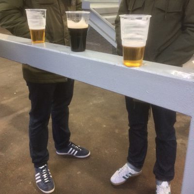 In der Pause, die selbstredend vor’m Block am Bierstand verbracht wurde, gönnte sich der hungrige Holzmichel erstmal einen Chicken Balti Pie und danach auch noch einen Steak & Ale Pie (je 4 £). Unser bärtiger Freund hatte schließlich so gut wie nichts gegessen bisher… Milano, Bene und mich interessierte dagegen nur das Bierangebot (4.50 £ für ein Pint Carlsberg oder Guinness) und Ole ohne Kohle, der es natürlich nicht wie geplant in den VIP-Raum schaffte, schlich in unseren Block zurück. Zu Beginn der 2.Hälfte schnappten wir uns noch schnell vier weitere Pints (die Kioske schließen dann endgültig) und tranken auch diese vor’m Fernseher außerhalb des Blocks (Alkohol im Block ist im britischen Profifußball nicht gestattet). Wir lauschten dabei dem berühmten „Will Grigg Song“ der Latics Supporters, aber ihre Kultfigur schmorrte weiter auf der Bank. Stattdessen hatten sie ihren Torwart ausgewechselt (Gilks für Haugaard), der sich mutmaßlich in der 1.Hälfte verletzt haben musste.