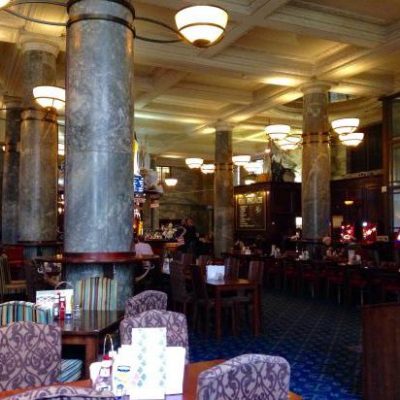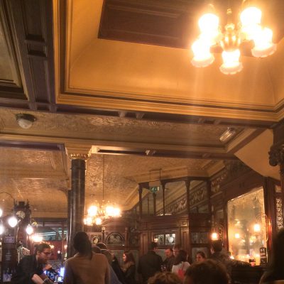 Nächster Stopp war wieder mal ein Pub aus dem Wetherspoon’s-Imperium von Brexit-Befürworter Tim Martin (er machte Brexit-Propaganda, obwohl über 3.500 Ausländer für ihn arbeiten). The Penderel’s Oak servierte nicht nur die nächsten Pints, sondern auch das langersehnte Abendessen, bzw. für den Holzmichel das zweite Abendessen. Hier gab es nun Gourmetburger (wahlweise Beef oder Chicken) für unsere gemütliche Reisegruppe und nach dem Essen näherte sich die Uhr schon wieder bedrohlich der Geisterstunde. Nun mussten wir unbedingt noch den traditionellen Gin Palace namens Princess Louise abhaken, der ein richtiges Kleinod ist.