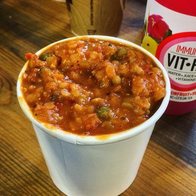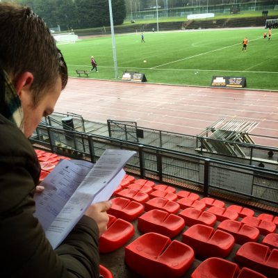 Das Spiel war zunächst ziemlich lahm und beide Mannschaften, die sich wahrscheinlich bisher noch nie begegnet waren, tasteten sich vorsichtig ab. Ole lernte daher nebenbei für eine Klausur und Milano verschwand mit dem Holzmichel und Bene nach 15 Minuten wieder, um einen Pub in Stadionnähe zu suchen. Sie verpassten wenig und es ging mit 0:0 in die Pause. Nun standen die Abtrünnigen auch schon wieder auf der Matte, da sie keinen Zufluchtsort entdecken konnten. Gemeinsam ging es in das Stadionlokal und wir tranken erstmal Kaffee. Ich wagte mich außerdem noch an das Lunch Special, einen mutmaßlich hausgemachten Linseneintopf mit Hähnchenbrust und exotischer Würzung, für den gerade mal 1 £ pro Cup verlangt wurde. War nicht nur günstig, sondern auch lecker und ich blieb deshalb kein Einzeltäter.