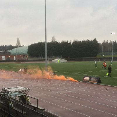 Das Spiel wurde nun durch die Fenster der Wirtschaft so halbwegs verfolgt und es fielen sogar noch vier Tore. Beim 2:1 in der 84.Minute für die Hausherren war ich als Einziger aus unserer Reisegruppe wieder in der Kälte draußen und genoß die spannende Schlussphase. Nun warf der Gast natürlich alles nach vorne und es machte nochmal richtig Laune zuzuschauen. Als ihnen dann in der 89.Minute tatsächlich noch das 2:2 gelang, feierten sie das Tor fast schon so frenetisch wie eine Meisterschaft und der ebenso ausrastende Gästepöbel warf eine orangefarbene Rauchfackel Richtung Kunstrasen. Zumindest ich bereute den Stadionbesuch nicht.