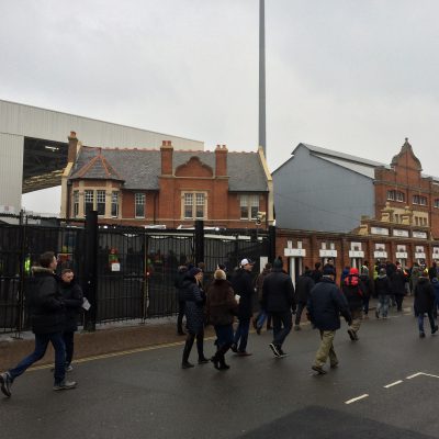 Nach der Kartenkontrolle warteten Pyrospürhunde und Anti-Pyroplakate auf uns. Wahrscheinlich will man einfach schon präventiv alles unternehmen, um die schrecklichen Szenen von leidenschaftlicher Stimmung aus dem Ausland am Themseufer zu verhindern. Der DFB wäre stolz auf Euch! Wir hatten zum Glück keine Spuren vom Silvesterfeuerwerk oder der jüngsten wunderschönen Choreographie bei 96 (25 Jahre DFB-Pokalsieg ’92) an unserer Kleidung und konnten ungestört auf unsere Plätze auf der Hintertortribüne spazieren. Hier hatten wir einen schönen Blick auf die historische Haupttribüne, sowie rechts neben uns das Cottage (eine Jagdhütte aus der Zeit, als hier noch Wald war) und links neben uns die Gästefans aus Wigan.