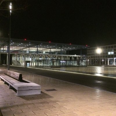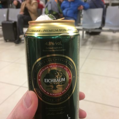 Am Abflugtag starteten wir mitten in der Nacht mit dem PKW zum Berliner Flughafen Schönefeld bzw. zu dessen Nachfolger in spe. Zwei Stunden vor Abflug erreichten wir das bereits einsatzbereite BER-Parkhaus (39 € pro Fahrzeug und Woche) und mit einem kostenlosen Shuttlebus ging es weiter zum altgedienten SXF. Nach der Sicherheitskontrolle blieb noch genug Zeit, um einen Flachmann Berliner Luft zu erwerben. „Hier Männers, wollta ma probier’n? Berliner Luft, juter Stoff!“, sprach der Shopmitarbeiter uns an. „Och na ja, warum nicht?“, entgegneten wir. „Na, schmeckt wa? Könnta ooch koofen, ne.“ „Na gut…“. Anstatt des Schnapses wollten wir anschließend jedoch lieber mit einem Bier im Terminal D auf den Kurzurlaub anstoßen. Der Shop Relay rief allerdings sportliche 4,15 € pro Dose (0,5 l) Berliner Pilsener oder Kindl auf, aber zum Glück gab es im Souvenir-Shop auch Eichbaum Pilsener für 1,50 € pro Dose (Sonderpreis aufgrund von MHD 02/2017). Und schon war das Bierproblem preisbewusst gelöst.