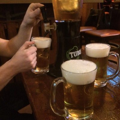Wir hatten nun erstmal genug Sehenswürdigkeiten besucht und gönnten uns Feierabendbier in der gehobenen Weinbar Corks. Neben hunderten von Weinen aus aller Welt und aller Preisklassen, gab es dort Stella Artois als einziges Bier vom Faß. Also für uns Biertrinker keine Qual der Wahl und dafür volle Konzentration auf die weitere Abendplanung. Die Kneipe Oktoberfest, wovon es mindestens drei in Bukarest gibt, wurde uns empfohlen und die war nicht so übel, wie der Name vermuten ließ. Mit einer Biersäule (2,5 l) für ungefähr 13 € wurden dort die Trinkfestspiele eröffnet und es folgten noch zwei Meter (je acht 0,4 l) für circa 12 €, was somit vom Literpreis her der bessere Deal war. Die Bedienung fand unsere Leistung sehr respektabel und hätte sich sicher über Meter Nummer 3 gefreut, aber wir wollten dann doch nochmal was anderes sehen. Von ihremTrinkgeld wird sie nun möglicherweise ihre eigene Bierhalle eröffnen können.