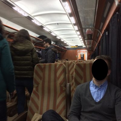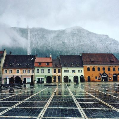 Mit dem Taxi machten wir uns relativ zerstört auf zum Gara de Nord (Nordbahnhof). Der Taxifahrer dachte wohl auch, wir kämen gerade vom Feiern und brachte uns zum Bahnhofshotel. „Is this your Hotel?“ „Äh, yes. Thank you very much.“ Im Bahnhof war schon recht buntes Treiben und es gab preiswertes Frühstück beim Bäcker. Pünktlich um 7 Uhr fuhr dann der Zug nach Brașov los. Unsere attraktive Sitznachbarin wirkte ab und an recht amüsiert, wenn wir denn mal die Augen offen hatten und den Nachdurst mit riesigen Colaflaschen (2,5 l) bekämpften oder über typische Jungs-Themen kommunizierten. Wir haben in unserem jugendlichen Leichtsinn natürlich gedacht, dass ihr rumänischer Roman echt witzig sein muss. Dass sie all unsere Komplimente verstand, stellte sich in Brașov heraus, wo sie uns grinsend „Schöne Ferien noch“ wünschte. Ansonsten war das eine recht zähe Zugfahrt, bei der der Zug mit 30 km/h durch die verschneiten Karpaten tuckerte und entsprechend die planmäßigen 2,75 Stunden für 166 Schienenkilometer benötigte.